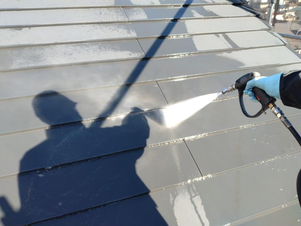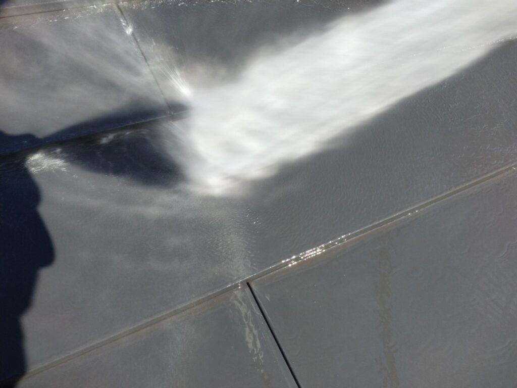 塗装工程は高圧洗浄から始まります。当該現場の屋根勾配は極端に急ではありませんでしたが、水で濡れたガルバリウム鋼板は非常に滑りやすく、常に緊張感を持ちながらの作業となりました。