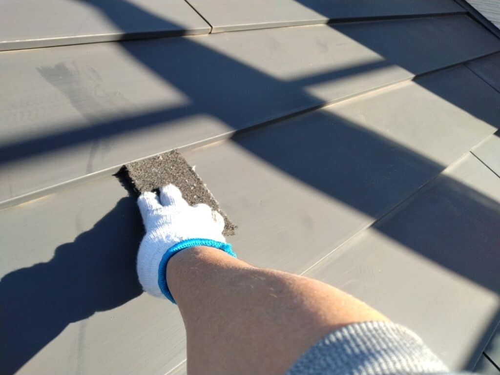 過去に原本職人は、他社施工のガルバリウム屋根で、重なり目に塗料を詰め込みすぎたことが原因で雨漏りが発生した現場を確認したことがあります。吸い上げられた水が釘穴を伝い、建物内部へと侵入してしまう非常に深刻な事例でした。この経験があるからこそ、今回の施工ではより一層慎重な対応を徹底しました。