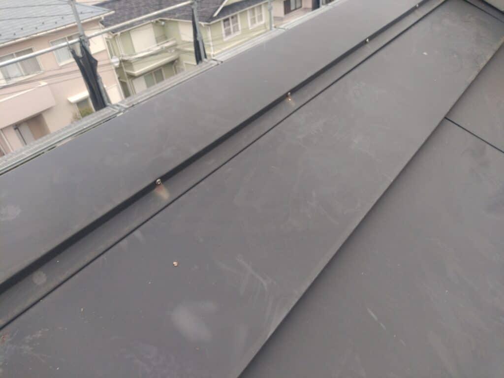 お宅の屋根はガルバリウム鋼板の横葺き形状でした。ガルバリウム鋼板は建材としての耐久性が高い一方で、表面が非常に平滑であるため塗料の密着性を確保することが難しく、さらに構造上、一般的なスレート屋根とは全く異なる独自の施工基準が求められます。