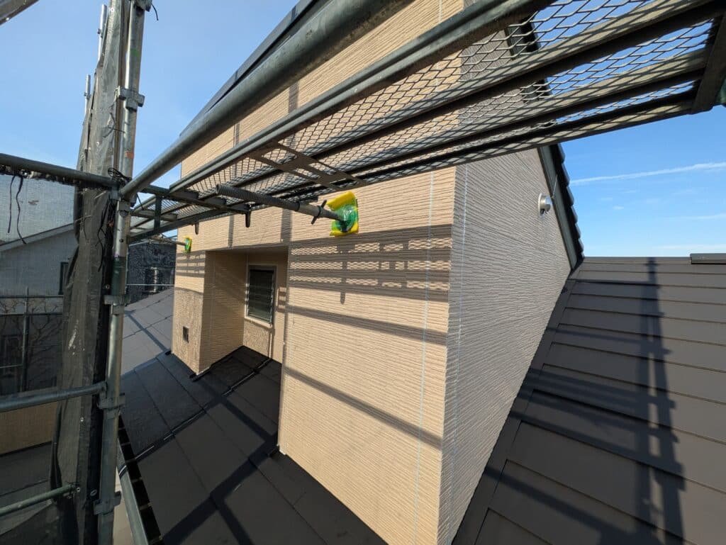 屋根がうっすら黄色くなるほどの飛来量があり、塗装のタイミングを見極める必要がありました。黄砂や花粉は塗膜の密着に影響を与えるため、天候や風の状況を見ながら、最適なタイミングで施工を進めています。こうした自然条件への対応も、現場では非常に重要な要素です。