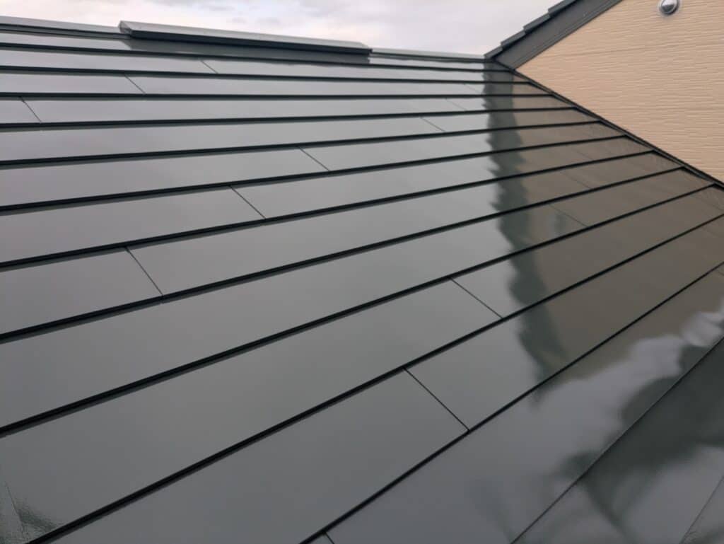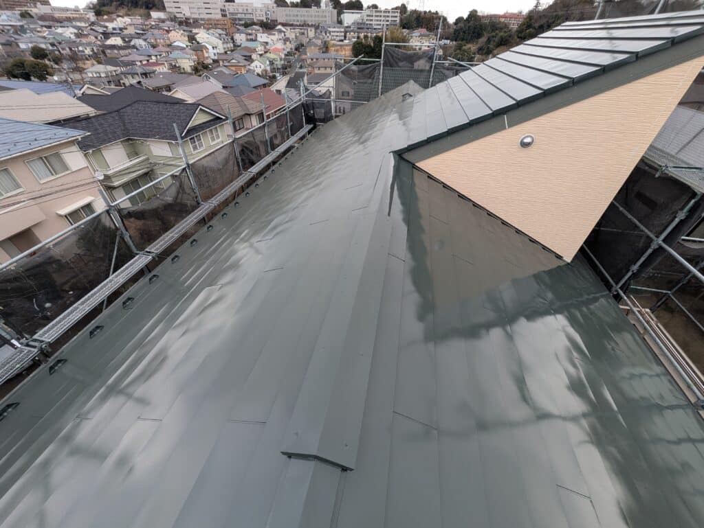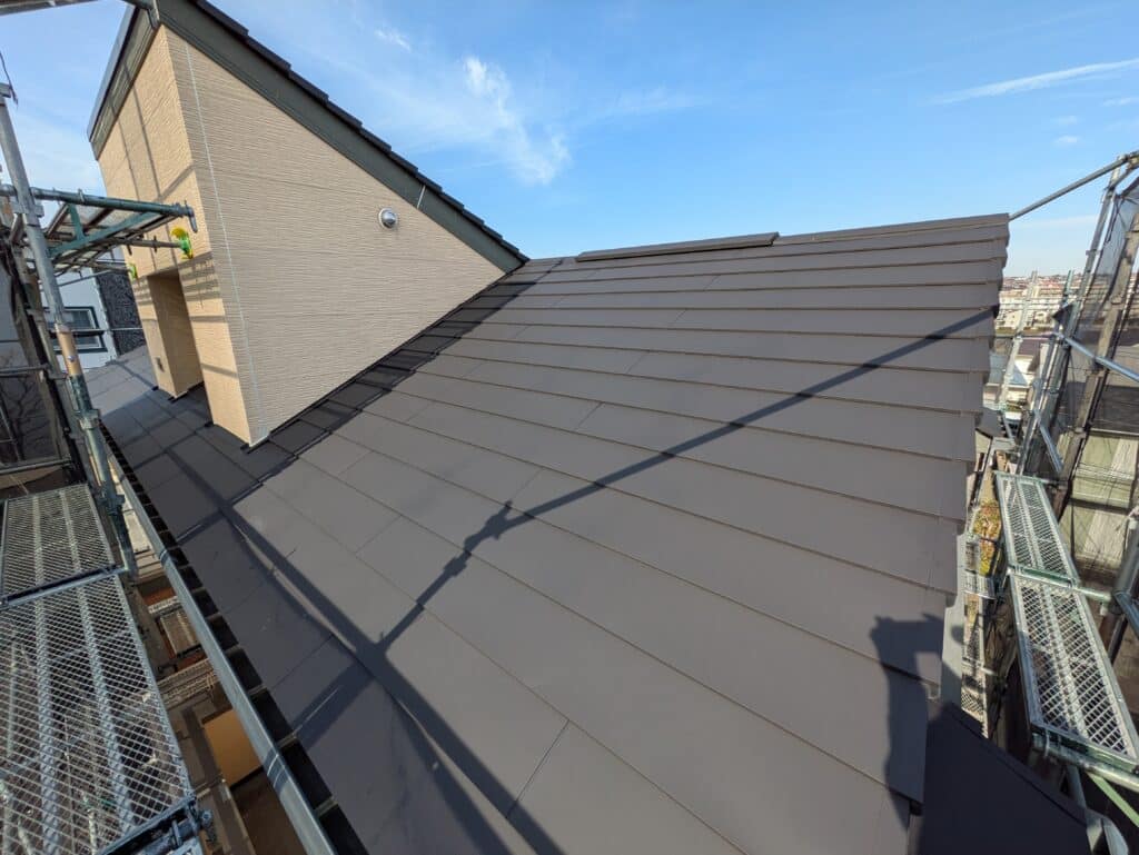 こうして完成した屋根は、フッ素塗料ならではの美しい艶と、しっかりとした塗膜を兼ね備えた仕上がりとなりました。見た目の美しさはもちろん、長期間にわたって建物を守る耐久性も確保できています。