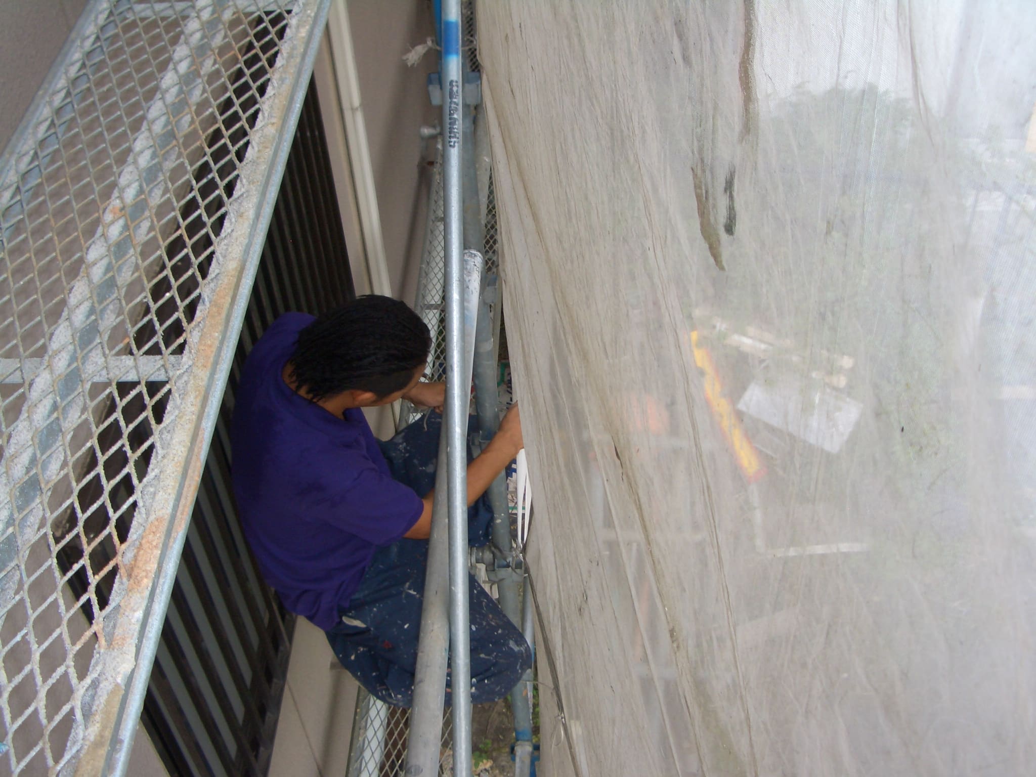 - 下にブルーシートを敷いて、ケレンのゴミや塗料が垂れても問題ないよう準備します。足場の周囲にはマスカーを張ってテープで固定しておきました。