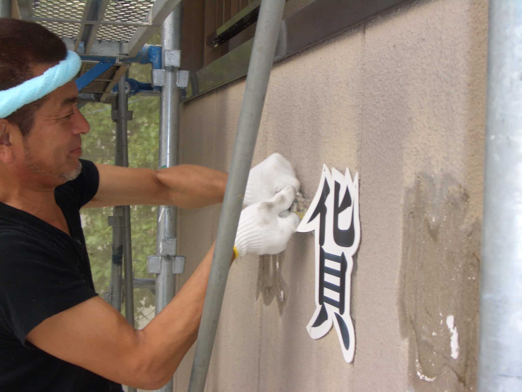 - 外壁を塗るため、看板を撤去しています。まず、固定してあるネジをドライバーで外しました。看板の裏側に皮スキ(ヘラ)を差し込んで、全体を剥がしていきます。