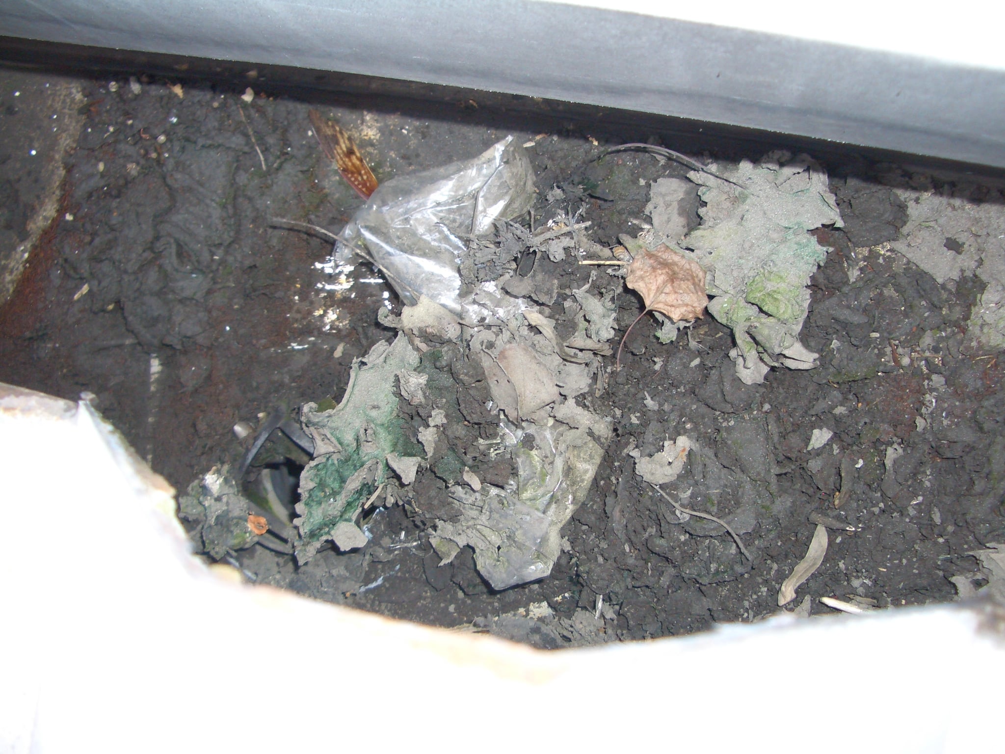 - 横樋の中に砂や葉っぱ、ビニールなどが溜まっていました。洗浄をしたときに樋が詰まらないよう、先にゴミを取り除いておきます。