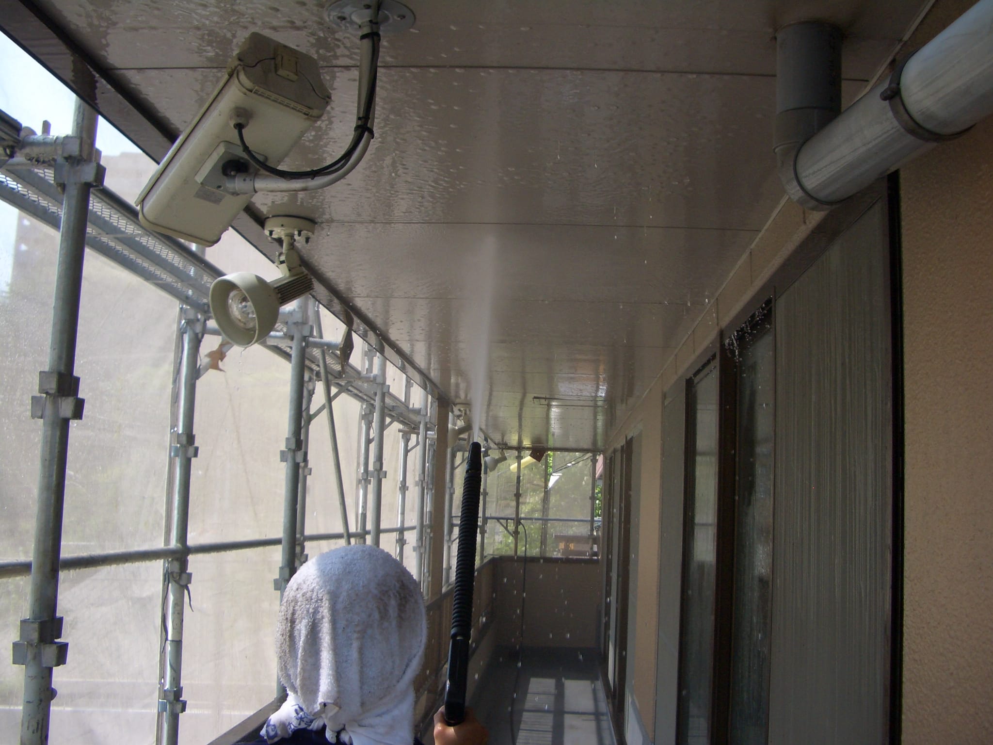 - 軒裏を洗浄しています。上に向けているので、しぶきが勢いよく自分に返ってきますが徹底的に洗い落としていきます。くもの巣も一緒に洗い流しました。