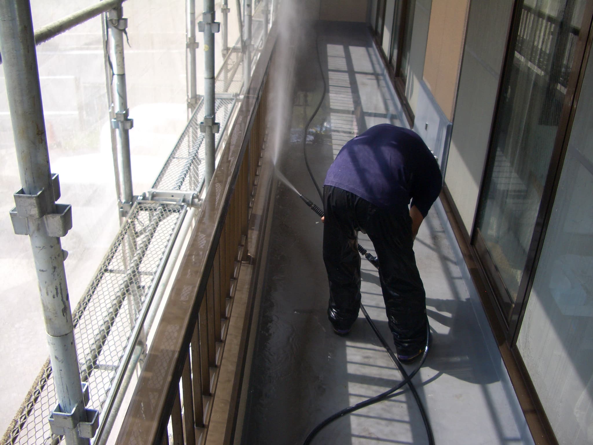 - ベランダを洗っています。手すりや笠木の隙間なども確認しながらしっかり洗いました。塗装面だけでなく、全体の汚れを落として準備します。