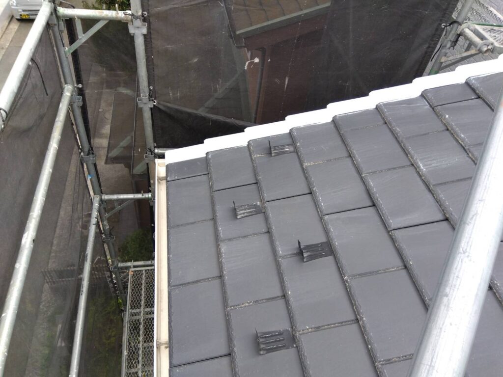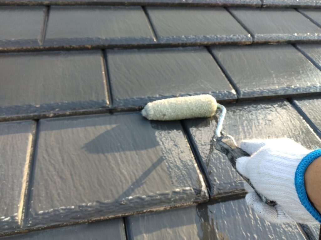 屋根は厚みがあり、溝が深い大和スレート。アーバニー風(コロニアル系の厚物)のように、形状がしっかりしたタイプです。この屋根は溝に塗料が溜まりやすく、乾燥不足のまま重ね塗りすると、垂れ・ベタつき・密着不良の原因になります。見た目は乾いているようでも、溝の中は乾いていないことがあるんです。