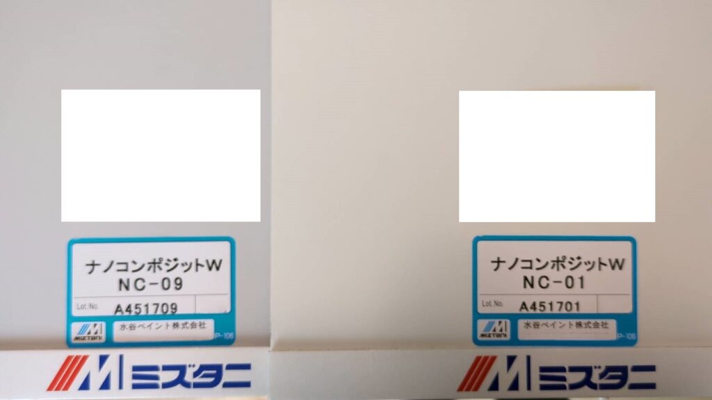 そこで今回は、塗料メーカーへ特注色として発注し、“外壁のスケール”で成立する色味に調色してもらう方向で進めました。使用塗料はナノコンポジットWを前提に、狙いのブルーグレーへ合わせ込んでいきます。