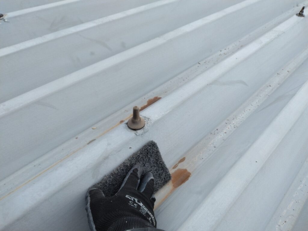そこで今回はマジックロンを使い、屋根全体のサビ落としと目荒らし(細かな傷をつけて塗料の食いつきを良くする作業)を丁寧に行いました。折半屋根は凹凸がある分、谷部・山部・重なり部など、道具が当たりにくい箇所も多いので、均一に仕上げるには地味に時間がかかります。