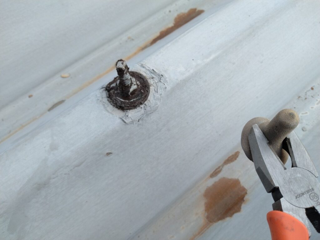 そこで、塗装を担当する一級塗装技能士の原本職人が念のため屋根に上がり、お部屋の上を確認したところ、折板屋根のボルトキャップが欠損していることがわかりました。