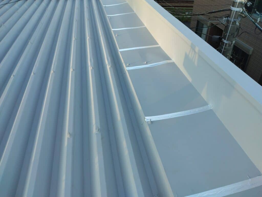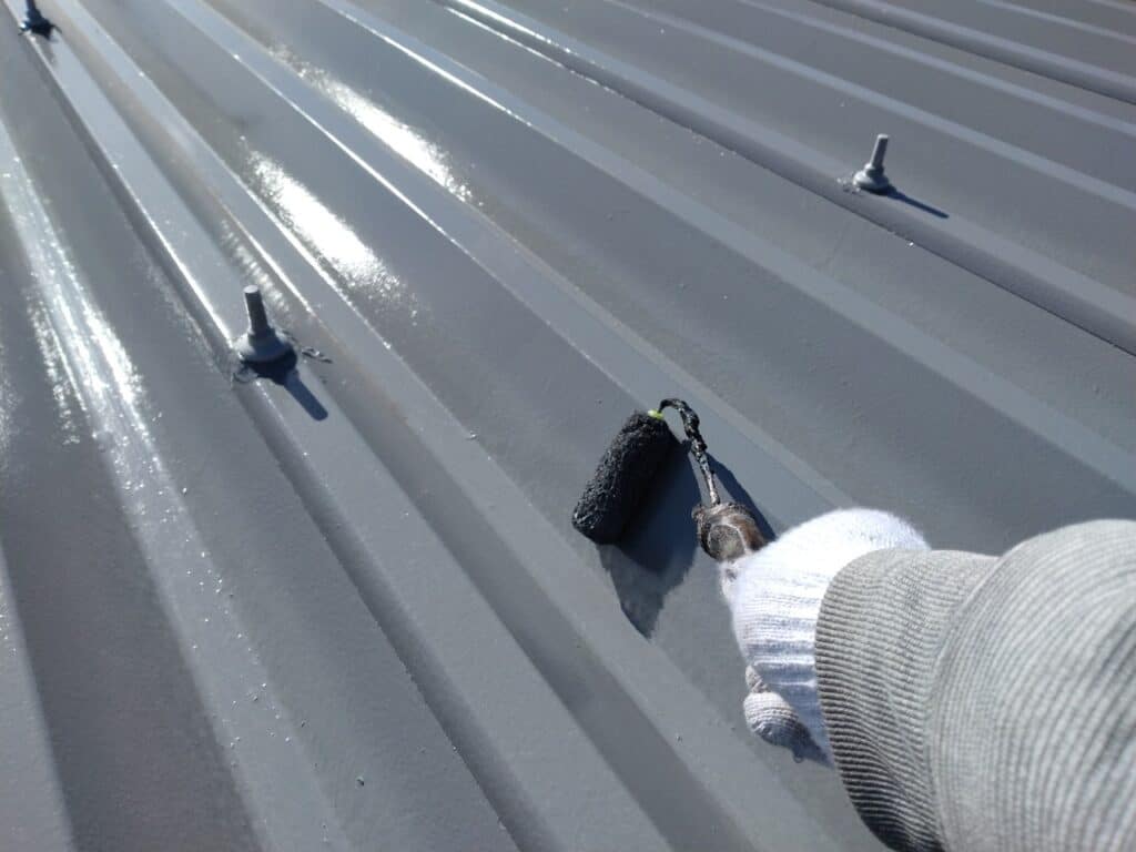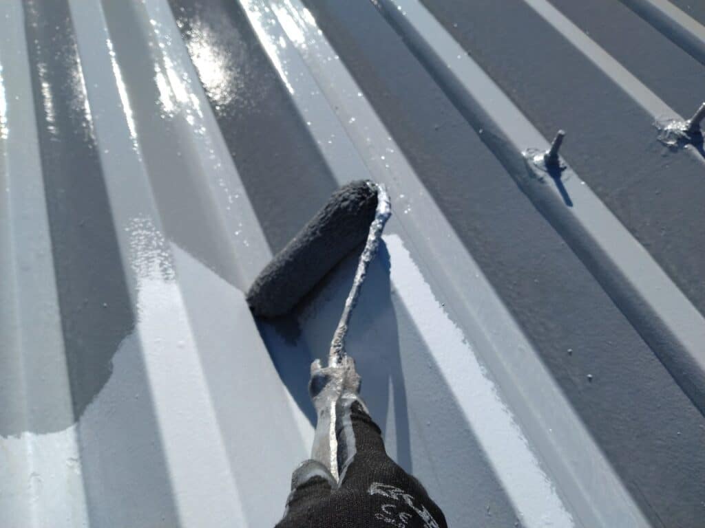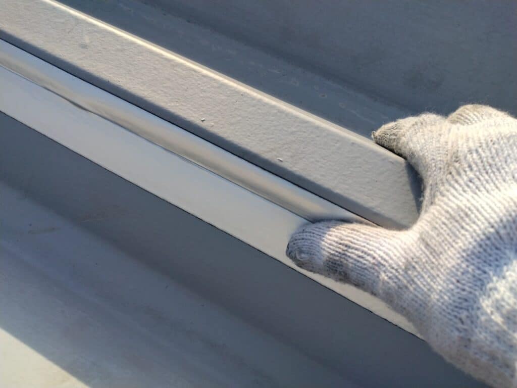 折半屋根は山と谷の形状があるため、わずかな隙間からでも雨水が回り込みやすく、塗装だけでは雨漏り対策として不十分なケースがあります。そこで、シールで水の通り道を先に断ってから塗装工程へ進めました。