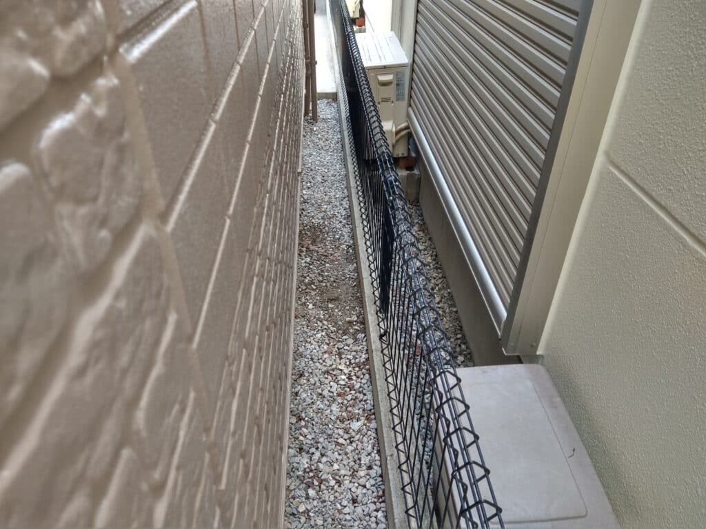 その際、弊社では足場を敷地内にぎりぎり立て、空中吊り下げにする、高圧洗浄時にメッシュシートにプラスしてビニールシートを追加するなど工夫しながら最大限努力します。