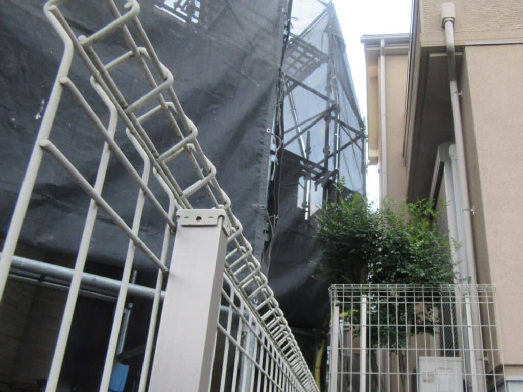 そのため、足場の建地と境界が密接している現場や、塗装する外壁に接する形でお隣の駐車場があるケースが増えています。